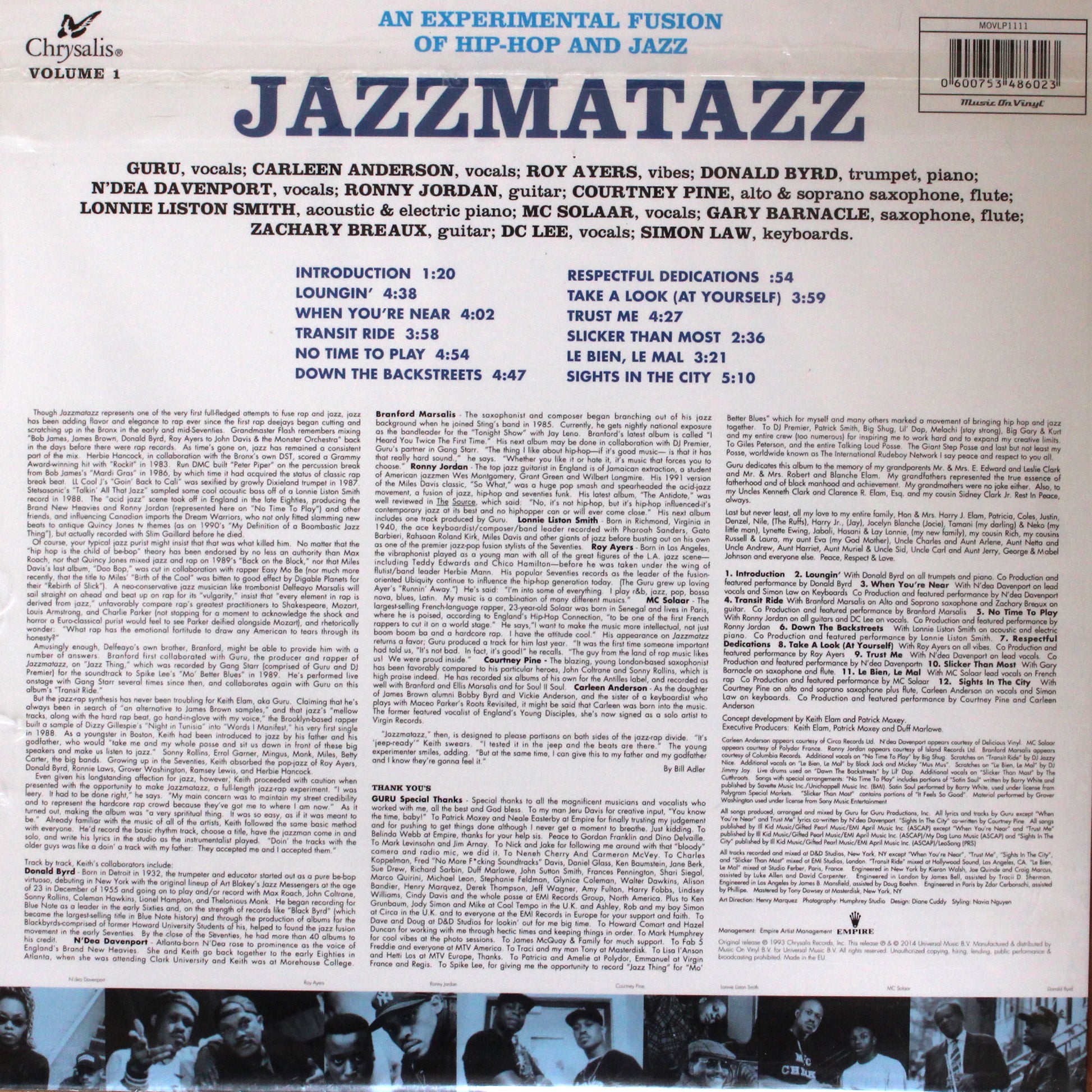 Guru’s Jazzmatazz 1, originally released in 1993, is one of the first albums to combine a live jazz band with hip hop production and rapping. Guru had a vision and brought together a diverse group of jazz cats both old and new school; Lonnie Liston Smith, Branford Marsalis, Ronny Jordan, Donald Byrd and Roy Ayers and vocalists like Carleen Anderson, N’Dea Davenport (Brand New Heavies) and French rapper MC Solaar have cooperated on this classic album.